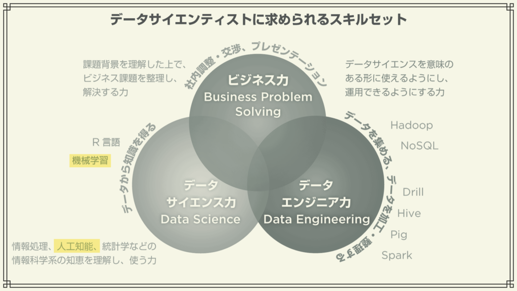 データサイエンティスト協会では、データサイエンティストに必要なスキルとして、①ビジネス課題を抽出、解決する「ビジネス力」②最新の分析手法を採り入れたりAI(人工知能)の論理展開を考えたりする「データサイエンス力」③分析の仕組みをシステムに実装する「データエンジニアリング力」の3つを核として掲げています。